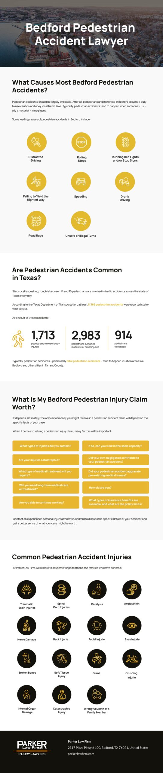 Were you recently hit by a car while walking in Bedford, Texas? Contact Parker Law Firm Injury Lawyers. You may have the right to recover compensation for the costs of your medical treatment, disability, and pain and suffering you’ve experienced. Our Bedford pedestrian accident lawyers can help you work toward a meaningful and substantial financial recovery.