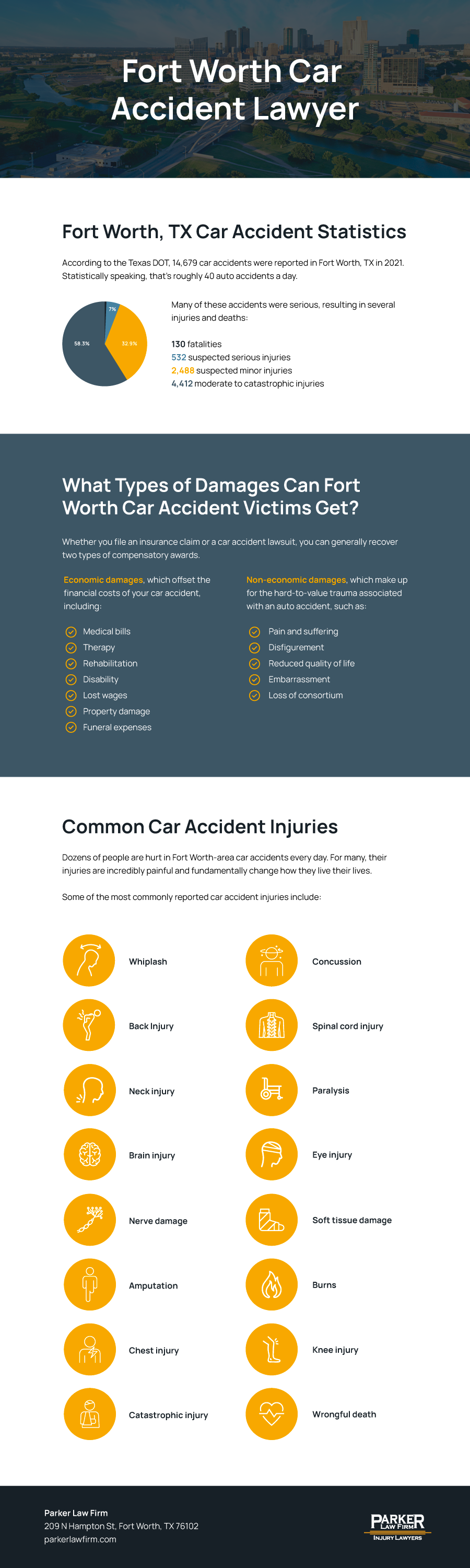 Did you recently get hurt in a car accident in Fort Worth, Texas? You may be entitled to compensation for your trauma, medical expenses, and disability. The experienced Fort Worth car accident lawyers at Parker Law Firm Injury Lawyers can help you fight for the money you deserve. Call our law office at (817) 839-3143 to discuss your options.